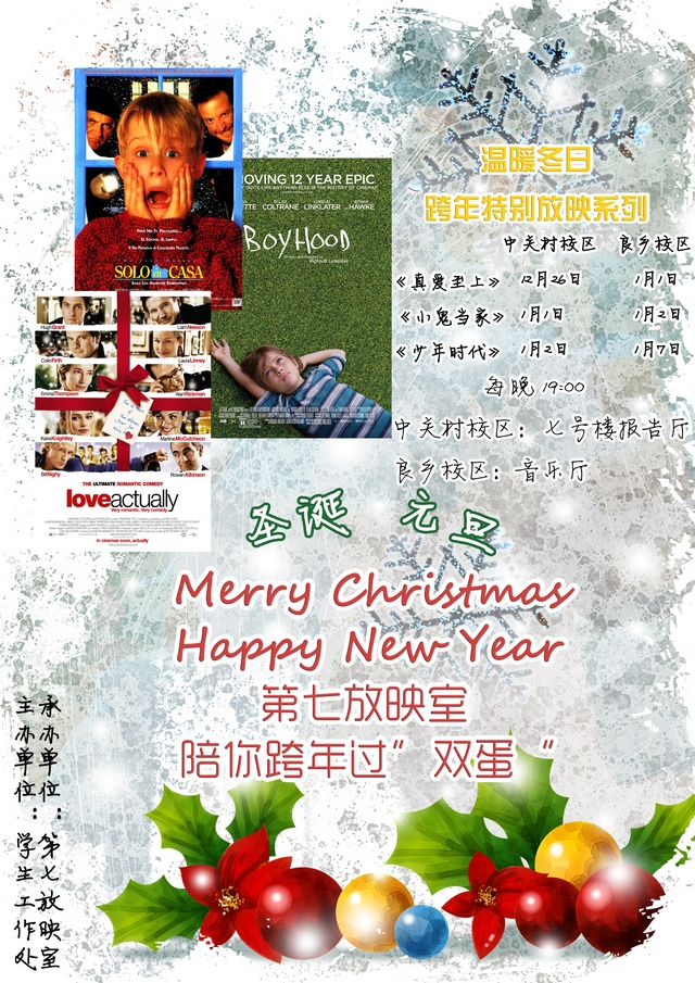 为了迎接新年到来,进一步活跃校园氛围,丰富同学们的课余生活,学生工作处第七放映室将在元旦前后举办“温暖冬日跨年特别放映”活动。活动期间,第七放映室选取了《真爱至上》、《小鬼当家》和《少年时代》三部经典影片,希望大家能在欢声笑语中回味童年、感悟成长,体会爱情的浪漫和甜美,以更加年轻的心态迎接新的一年。影片放映安排如下: