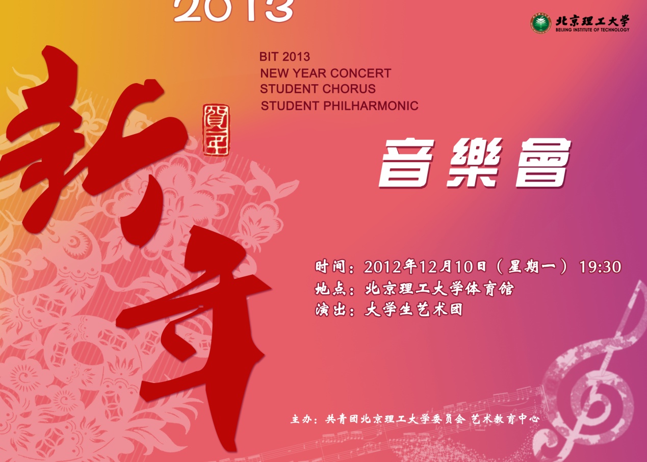 bb贝博艾弗森官方网站2013年新年音乐会将于2012年12月10日(星期一)19:30在中关村校区举行。学校团委将联系社区党工委、学校工会、离退休工作处、后勤集团、留学生中心及各学院组织票务登记及发票事宜。敬请关注。