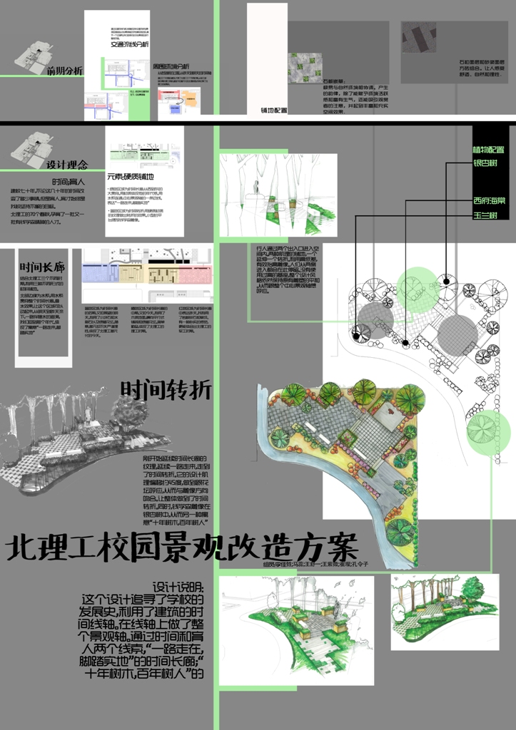 本次展出的方案,作者均为设计学院环境艺术设计系2010级本科生,在专业老师的指导下,学生们将校园景观改造与城市公共空间景观设计、植物景观设计课程学习相结合。在大学生校园景观需求调研、校园植物分析、钱学森像及周边环境分析的基础上,组成七个设计小组分别开展方案设计。所展出的五组方案,通过五个不同方向的设计尝试——小广场主题、植物群落主题、微地形主题、时间寓意主题以及思想迸发主题为立意展开钱学森像的迁移改造景观设计,以求创造美好的校园景观环境,对bb贝博艾弗森官方网站的校园景观改造作出自己的贡献。