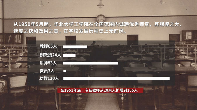 这一时期,为适应新的形式与任务,华北大学工学院与重工业部一同组织各方力量,在全国范围内诚聘优秀师资,其规模之大、速度之快和效果之高,在学校发展历程史上无前例。截至1951年年底,全校专任教师从20余人迅速发展到305人,其中教授65人,副教授24人,讲师83人,教员3人,助教130人。其中包括一大批国内知名专家: