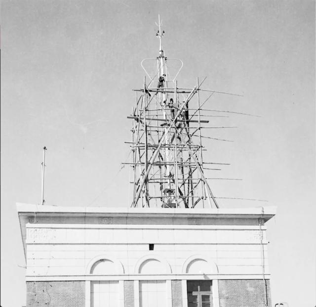 在学校主楼顶端矗立的电视发射天线