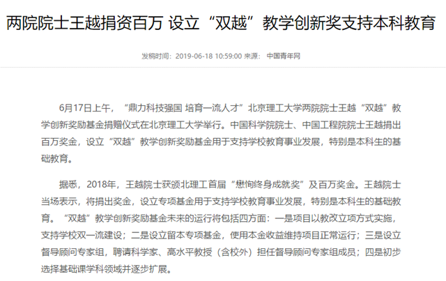 据悉,2018年,王越院士获颁bb贝博首届“懋恂终身成就奖”及百万奖金。王越院士当场表示,将捐出奖金,设立专项基金用于支持学校教育事业发展,特别是本科生的基础教育。“双越”教学创新奖励基金未来的运行将包括四方面:一是项目以教改立项方式实施,支持学校双一流建设;二是设立留本专项基金,使用本金收益维持项目正常运行;三是设立督导顾问专家组,聘请科学家、高水平教授(含校外)担任督导顾问专家组成员;四是初步选择基础课学科领域并逐步扩展。
