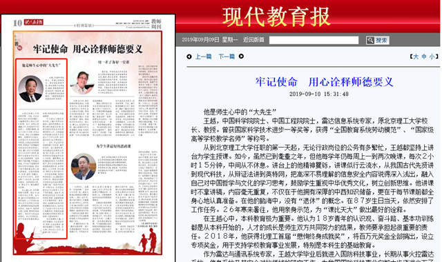 作为雷达与通讯系统专家,王越大学毕业后就进入国防科技事业,长期从事火控雷达系统、信息系统及其安全对抗领域的研究工作,为我国国防科技事业向前大步迈进立下了汗马功劳,是中国仅有的34位两院院士之一。当年,年过花甲的他接到新工作任命,离开研究所,进入高等学府,他迅速适应全新职业环境,将工作重心从军工科技转向应用基础研究和人才培育。履职期间,他组建起团结有力的领导班子,深化办学机制和内部管理体制改革,在学科建设、人才培养、队伍建设、科研产业等方面实行一系列改革措施,带领学校首批进入211国家重点大学行列。根据当时国家对信息安全的迫切需要,他建立起“信息对抗技术”本科专业,为中国信息安全专业培养人才打下良好基础。2018年,他带领信息安全与对抗教师团队荣获“全国高校黄大年式教师团队”称号。同时,他将教学改革与科技竞赛密切结合,组织设立了全国大学生电子设计竞赛项目,积极促进国家级教学和科研团队的培养,为国培育英才。