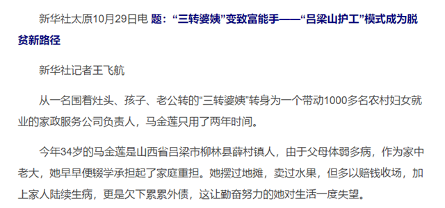 编辑:吴楠 审核:王征 阅读次数:原文标题:“三转婆姨”变致富能手——“吕梁山护工”模式成为脱贫新路径