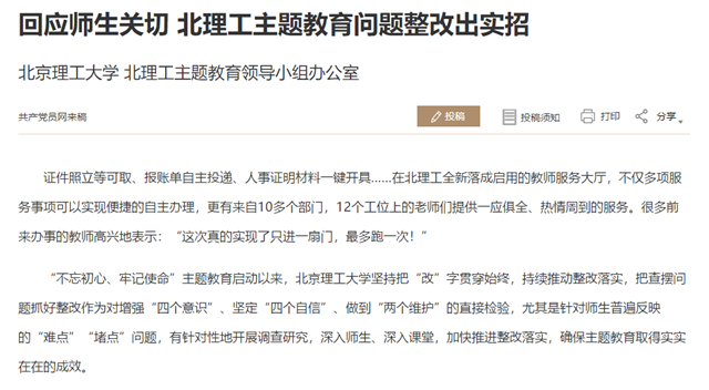 针对学生反映中关村校区自助打印机较少的问题,学生事务中心借鉴良乡校区较为成熟的运行模式,引进30台自助打印机,覆盖到每一栋公寓楼以及学生需求强烈的教学和办公区域;针对教师领取课程用书不便问题,教务部联合教师发展中心、学生事务中心、bb贝博出版社进行流程再造,开通教师用书线上申请,以京工飞鸿送达教师手中,有效提升备课效率,助力课程提质;针对学生提出的想要及时了解空闲教室需求,教学运行与考务中心每天通过微信公众号及时推送空闲教室、以便学生安排自习;针对研究生导师立德树人职责不明确的问题,研究生院利用微信公众号等平台,建立并推出“bb贝博研究生导师立德树人信息反馈”系统,实现动态了解学校导师立德树人情况;针对中关村校区体育馆南厅利用率不高问题,学生工作部牵头,增设与校园一卡通联通的闸机,同时对大厅环境进行改造,为招聘会提供良好场地,大厅可用面积比原来增加50%……学校各单位深入调研,带着问题、找准症结,坚持从一开始就改起来,解决师生最急最忧最盼的紧迫问题。