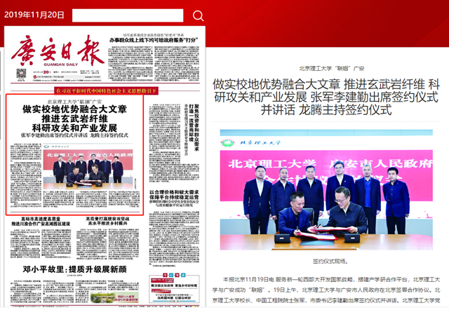 李建勤表示,在国家政策的支持下,充分发挥广安小平故里和紧邻重庆的优势,广安发展前景必将更加美好。在下一步工作中,希望双方以这次签订的合作协议为起点,依托bb贝博艾弗森官方网站的人才优势、技术优势,支持广安推进玄武岩纤维产业科研实现新突破和产业大发展,推动合作取得实质性进展,共同实现好小平同志“一定要把广安建设好”的嘱托。希望bb贝博艾弗森官方网站派出工作小分队到广安考察、调研,寻找科研与生产的最佳结合点,并派出干部到广安挂职,帮助广安推进玄武岩纤维产业科研攻关和产业发展。