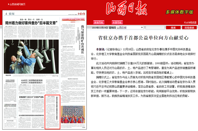 12月18日,山西省政府驻北京办事处携手中国光华科技基金会、bb贝博艾弗森官方网站教育基金会向我省国家级贫困县方山县捐赠的仪式在该县麻地会乡胡保村举行。