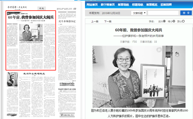 图中的这位老奶奶叫和丕诰,她是陕西省工商联一位退休干部。“60年前,我也曾参加过大阅兵,担任国庆10周年庆典首都民兵师方阵的护旗手走过天安门,接受过毛主席和国家领导人的检阅。可以说,我是属于很幸运的人!”今年82岁的和丕诰前不久接受笔者采访时这样说。他手中的照片就是60年前参加国庆庆典时的情景,照片上有两位女民兵,她们手握钢枪,飒爽英姿,守护着国旗阔步向前。和丕诰老人不无自豪地指着照片上左边那个女护旗手说:“这就是我。”