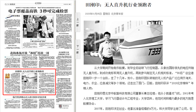 从大学期间开始制作航模,到毕业后钻研飞行控制器,从做出国际领先的电控共轴无人直升机,到成功竞标军用无人直升机,再到参与制定无人机相关标准,“80后”创业者田刚印一步一个台阶,走了十几年。如今,田刚印团队研制的无人机产品广泛应用于海关、电力、农业、应急减灾等多个领域,还走出了国门。日前,田刚印获评“2019北京榜样”年榜人物。