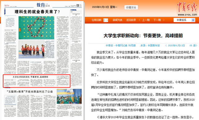 “这种集中扎堆儿的情况不仅体现在民营企业,国有企业、机关事业单位和各类选调生等性质的招聘也进校的时间明显都提前。因此,这样的招聘节奏下,我校2020届1月毕业学生的签约情况明显加快了,签约人数较往年同期增长很多,选择京外就业的毕业生明显增加。”刘晓杰告诉中青报·中青网记者。