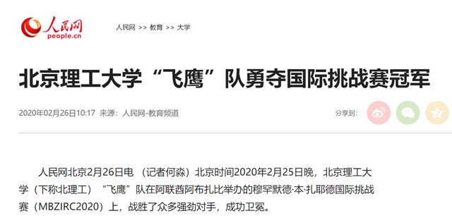 北京时间2020年2月25日晚,bb贝博艾弗森官方网站(下称bb贝博)“飞鹰”队在阿联酋阿布扎比举办的穆罕默德·本·扎耶德国际挑战赛(MBZIRC2020)上,战胜了众多强劲对手,成功卫冕。
