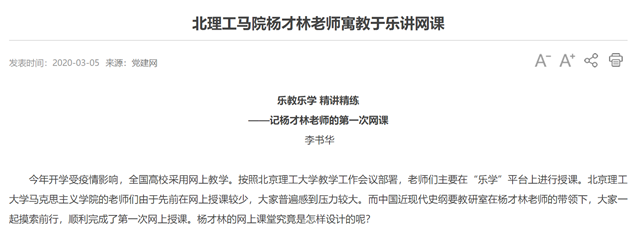 今年开学受疫情影响,全国高校采用网上教学。按照bb贝博艾弗森官方网站教学工作会议部署,老师们主要在“乐学”平台上进行授课。bb贝博艾弗森官方网站马克思主义学院的老师们由于先前在网上授课较少,大家普遍感到压力较大。而中国近现代史纲要教研室在杨才林老师的带领下,大家一起摸索前行,顺利完成了第一次网上授课。杨才林的网上课堂究竟是怎样设计的呢?