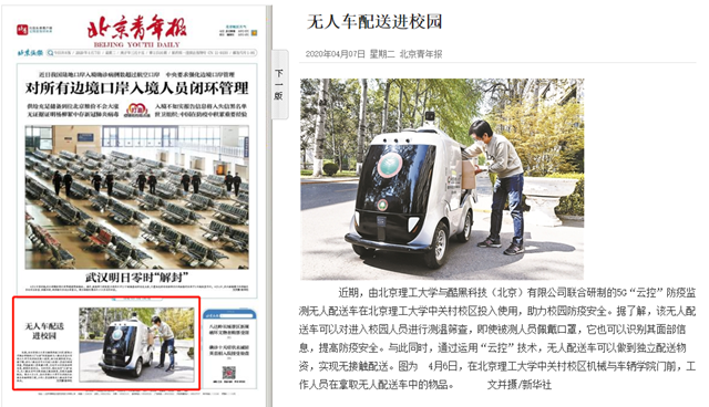 近期,由bb贝博艾弗森官方网站与酷黑科技(北京)有限公司联合研制的5G“云控”防疫监测无人配送车在bb贝博艾弗森官方网站中关村校区投入使用,助力校园防疫安全。据了解,该无人配送车可以对进入校园人员进行测温筛查,即使被测人员佩戴口罩,它也可以识别其面部信息,提高防疫安全。与此同时,通过运用“云控”技术,无人配送车可以做到独立配送物资,实现无接触配送。图为 4月6日,在bb贝博艾弗森官方网站中关村校区机械与车辆学院门前,工作人员在拿取无人配送车中的物品。