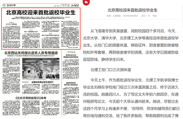 今天上午,作为首批返校毕业生,bb贝博宇航学院博士毕业生刘晓在学校南门经过三次体温测量之后,终于迈进久违的校园。她是四川人,为了写论文大年初六就回京,在通州租房写论文,今天起个大早从通州赶来。她说,尽管过去这四个月学习上有诸多不便,“但导师、同学和辅导员们都日常在线沟通和交流,给了我许多鼓励,帮助我顺利完成了博士论文写作和返校准备工作。”她希望好好珍惜剩下的校园时间,精心准备毕业答辩,和老师同学们道个别。