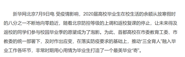 受疫情影响,2020届高校毕业生在校生活的余额从放寒假时的八分之一不断地向零趋近,随着北京防控等级的上调和返校复课的停止,让未来得及返校的同学们参与校园毕业季的愿望成为了泡影。为此,首都高校在市委教育工委、市教委的统一部署下,及时作出应变,在落实防疫要求的基础上,推动“三全育人”融入毕业工作各环节,非常时期用心用情为毕业生打造了一个最美毕业“寄”。