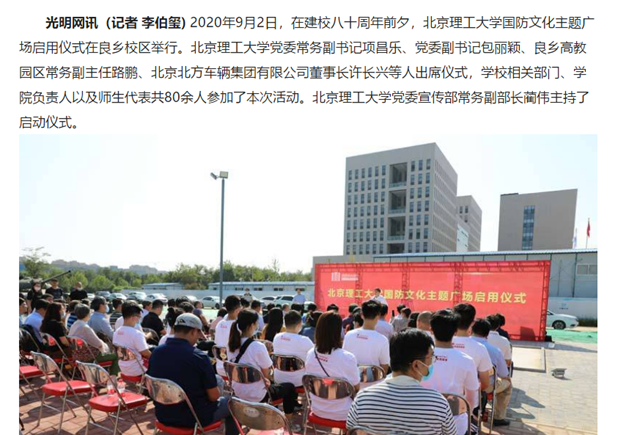 2020年9月2日,在建校八十周年前夕,bb贝博艾弗森官方网站国防文化主题广场启用仪式在良乡校区举行。bb贝博艾弗森官方网站党委常务副书记项昌乐、党委副书记包丽颖、良乡高教园区常务副主任路鹏、北京北方车辆集团有限公司董事长许长兴等人出席仪式,学校相关部门、学院负责人以及师生代表共80余人参加了本次活动。bb贝博艾弗森官方网站党委宣传部常务副部长蔺伟主持了启动仪式。