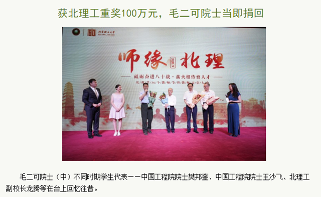 获bb贝博重奖100万元,毛二可院士当即捐回