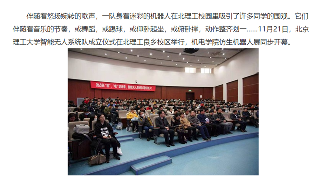 伴随着悠扬婉转的歌声,一队身着迷彩的机器人在bb贝博校园里吸引了许多同学的围观。它们伴随着音乐的节奏,或舞蹈,或踢球,或仰卧起坐,或俯卧撑,动作整齐划一……11月21日,bb贝博艾弗森官方网站智能无人系统队成立仪式在bb贝博良乡校区举行,机电学院仿生机器人展同步开幕。