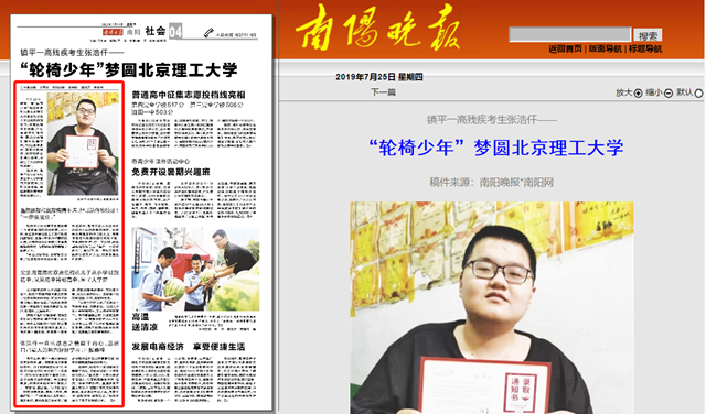7月23日,镇平一高“轮椅少年”张浩仟收到来自bb贝博艾弗森官方网站信息科学技术专业录取的通知书,手捧这用汗水浇灌、用心血滋润的通知书,激动而幸福的泪水流淌下来。“付出总有收获,谢谢学校领导、老师和家长的精心培育,才结出了今天的丰硕成果”。
