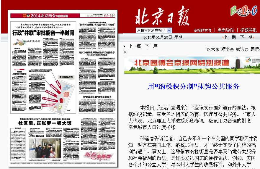 “除了房子,其实在北京的生活成本还是很低的,各种公共服务也比较完善。”孙逢春说,“但城市的资源毕竟有限,应该有一个做出贡献与享受待遇挂钩的机制。”他建议可以建立一项“纳税记录积分制”,根据不同时间长度的纳税记录,分别给予不同的教育、医疗、文化等公共服务待遇。