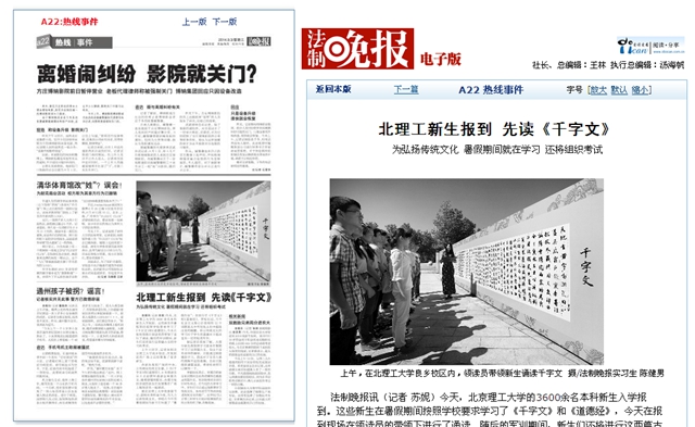 【法制晚报】bb贝博新生报到 先读《千字文》