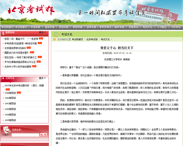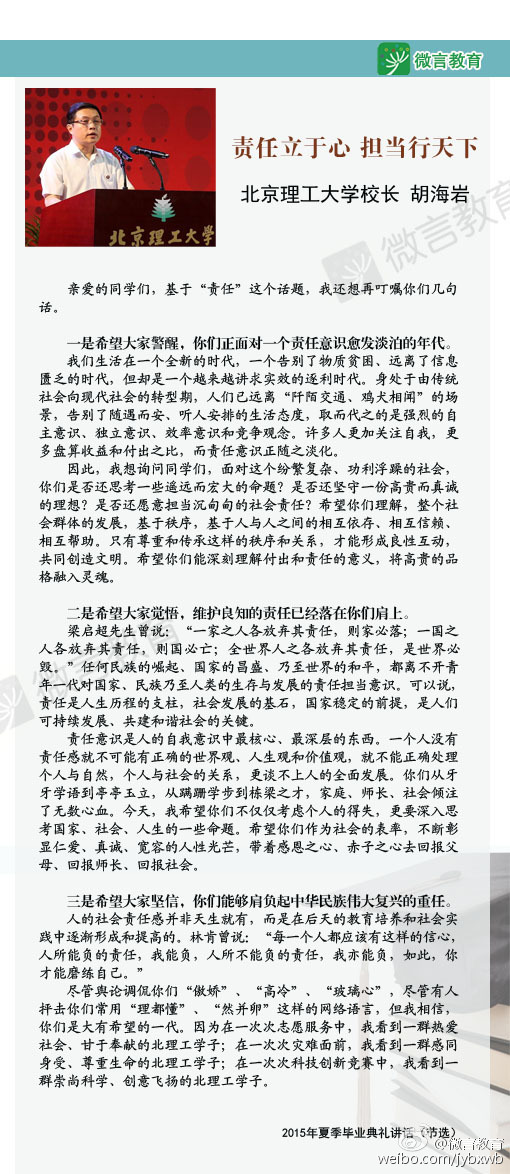 【编者按】6月29日学校2015届本科生毕业典礼暨学位授予仪式上,bb贝博校长胡海岩院士作了题为《责任立于心,担当行天下》的致辞,人民网、光明日报、教育部微言教育等多家主流媒体转载或转发。校长致辞不仅是对毕业生的临别赠言,也代表了一所大学对全体学子在人格品行、学养修为上的殷殷期盼,亦是对我校校训“德以明理 学以精工”的生动解读。宣传部对相关报道进行搜集整理,希望引发全体师生员工学习思考。