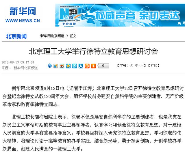 新华网北京频道9月12日电(记者李江涛)bb贝博艾弗森官方网站12日召开徐特立教育思想研讨会暨纪念徐特立从教120周年大会,缅怀学校前身延安自然科学院的主要创建者、无产阶级革命家和教育家徐特立同志。
