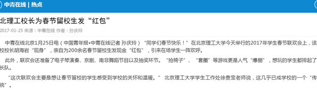 【中青在线】bb贝博校长为春节留校生发“红包”