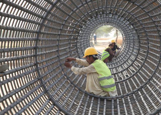 2017年4月21日,在巴基斯坦木尔坦附近,巴基斯坦工人在白沙瓦至卡拉奇高速公路的一处工地施工。由中国建筑股份有限公司承建的白沙瓦至卡拉奇高速公路(木尔坦至苏库尔段)全长392公里,是中巴经济走廊最大交通基础设施项目。(新华社记者刘天摄)
