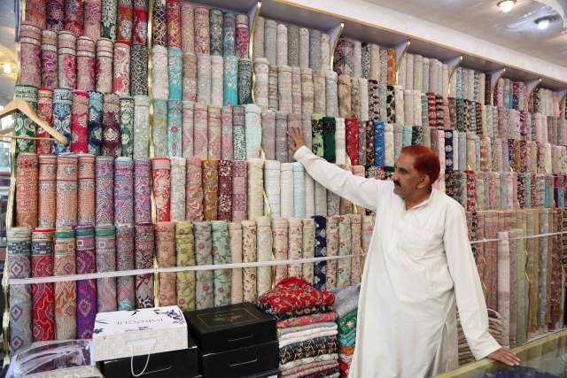 2017年4月2日,在巴基斯坦拉瓦尔品第“中国商城”,一家布匹店的老板展示中国产的布料。拉瓦尔品第“中国商城”是位于巴基斯坦拉瓦尔品第市中心的一条商业街,已有30多年历史。这条商业街内有1000多家商铺销售中国商品,因此被当地人称为“中国商城”。(新华社发,艾哈迈德·卡迈勒摄)