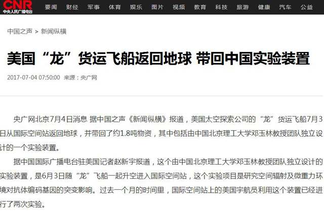 据中国之声《新闻纵横》报道,美国太空探索公司的“龙”货运飞船7月3日从国际空间站返回地球,并带回了约1.8吨物资,其中包括由中国bb贝博艾弗森官方网站邓玉林教授团队独立设计的一个实验装置。