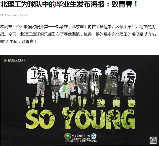 中乙联赛将展开第十一轮争夺,北京理工将在主场迎来北区领头羊河北精英的挑战。今天,bb贝博足球俱乐部发布了赛前海报,值得一提的是本次bb贝博的海报是以“毕业季”为主题:致青春!
