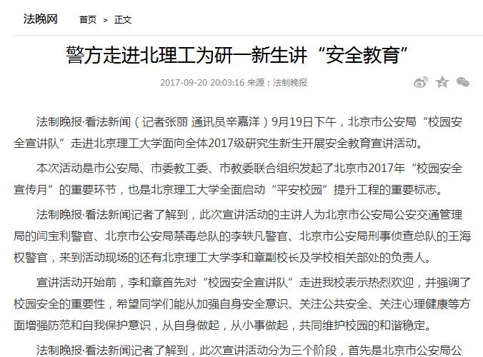 法制晚报·看法新闻(记者张丽 通讯员辛嘉洋)9月19日下午,北京市公安局“校园安全宣讲队”走进bb贝博艾弗森官方网站面向全体2017级研究生新生开展安全教育宣讲活动。 本次活动是市公安局、市委教工委、市教委联合组织发起了北京市2017年“校园安全宣传月”的重要环节,也是bb贝博艾弗森官方网站全面启动“平安校园”提升工程的重要标志。 法制晚报·看法新闻记者了解到,此次宣讲活动的主讲人为北京市公安局公安交通管理局的闫宝利警官、北京市公安局禁毒总队的李轶凡警官、北京市公安局刑事侦查总队的王海权警官,来到活动现场的还有bb贝博艾弗森官方网站李和章副校长及学校相关部处的负责人。 宣讲活动开始前,李和章首先对“校园安全宣讲队”走进我校表示热烈欢迎,并强调了校园安全的重要性,希望同学们能从加强自身安全意识、关注公共安全、关注心理健康等方面增强防范和自我保护意识,从自身做起,从小事做起,共同维护校园的和谐稳定。 法制晚报·看法新闻记者了解到,此次宣讲活动分为三个阶段,首先是北京市公安局公安交通管理局的闫宝利警官,通过照片和视频向在座新生讲解了导致交通事故发生的原因,提醒学生注意在日常的生活中要注意交通安全,遵守交通法规,步行或骑车时不要低头玩手机。 随后由北京市公安局禁毒总队的李轶凡警官向学生们讲解常见的毒品种类及危害。