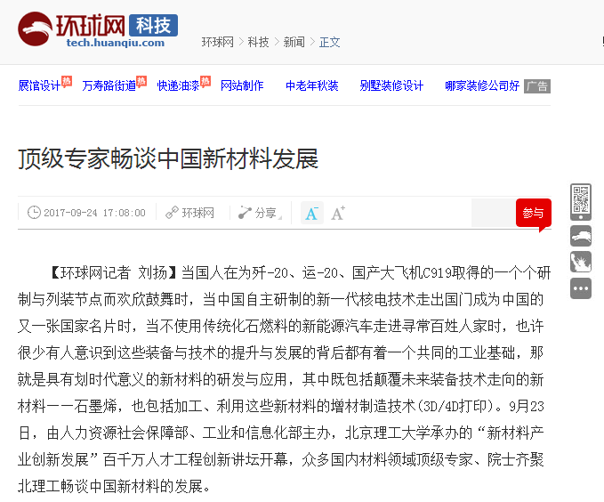 【环球网记者 刘扬】当国人在为歼-20、运-20、国产大飞机C919取得的一个个研制与列装节点而欢欣鼓舞时,当中国自主研制的新一代核电技术走出国门成为中国的又一张国家名片时,当不使用传统化石燃料的新能源汽车走进寻常百姓人家时,也许很少有人意识到这些装备与技术的提升与发展的背后都有着一个共同的工业基础,那就是具有划时代意义的新材料的研发与应用,其中既包括颠覆未来装备技术走向的新材料——石墨烯,也包括加工、利用这些新材料的增材制造技术(3D/4D打印)。9月23日,由人力资源社会保障部、工业和信息化部主办,bb贝博艾弗森官方网站承办的“新材料产业创新发展”百千万人才工程创新讲坛开幕,众多国内材料领域顶级专家、院士齐聚bb贝博畅谈中国新材料的发展。bb贝博艾弗森官方网站校长 胡海岩院士致辞时表示,bb贝博艾弗森官方网站21日正式入选国家“双一流”建设名单,“材料科学与工程”学科入选“双一流”学科名单。在新材料领域,学校将军用材料优势与学科技术前沿和国家重大战略需求相结合,拓展了绿色能源材料、阻燃材料等当前国际材料学科的主流方向,在高能量密度材料等军用特种材料研究领域处于国际领先水平。胡海岩强调,承担国家重大任务,是bb贝博人的使命与担当。力求为推动中国制造业转型升级,提升“中国制造”的品质和“中国创造”的影响力做出贡献。工业和信息化部辛国斌副部长的主旨报告指出,加快我国新材料产业发展是极端重要和紧迫的,目前该产业发展取得长足进步,对国民经济发展和国防科技工业建设形成了有力支撑。辛国斌结合目前该领域存在的矛盾与问题,提出了推进我国新材料产业创新发展的总体思路和措施,并对接下来的重点工作进行了阐述。