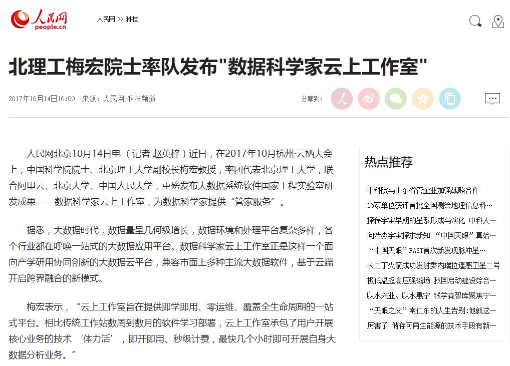 【人民网】bb贝博梅宏院士率队发布"数据科学家云上工作室"