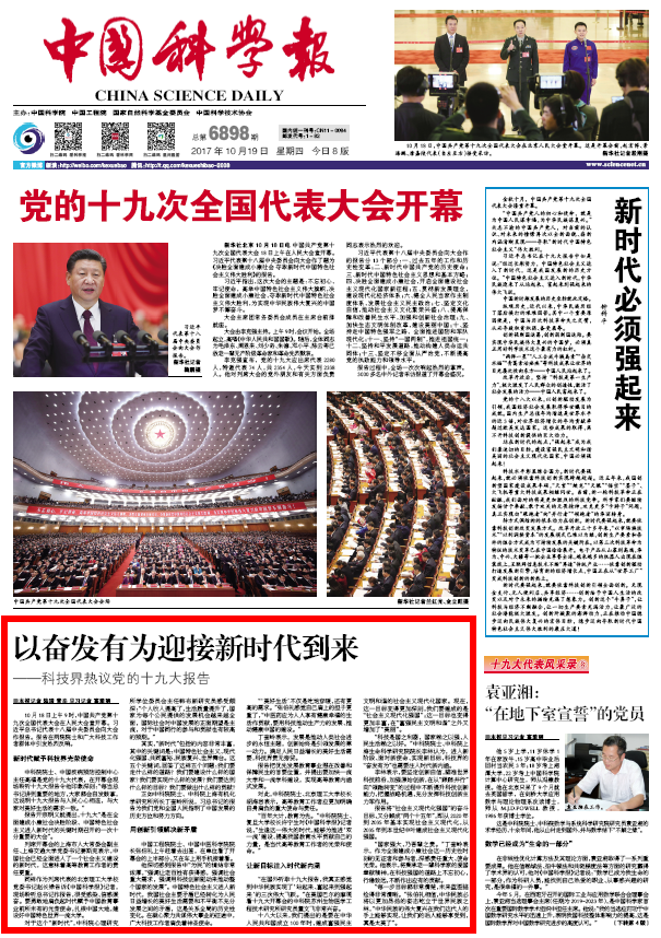 《中国科学报》以奋发有为迎接新时代到来——科技界热议十九大报告