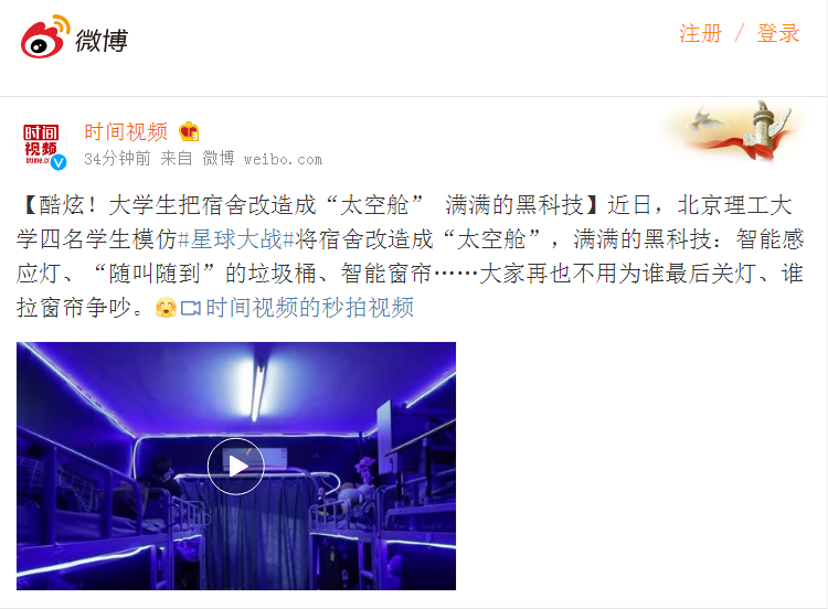 【微博·时间视频】bb贝博大学生把宿舍改造成“太空舱” 满满的黑科技