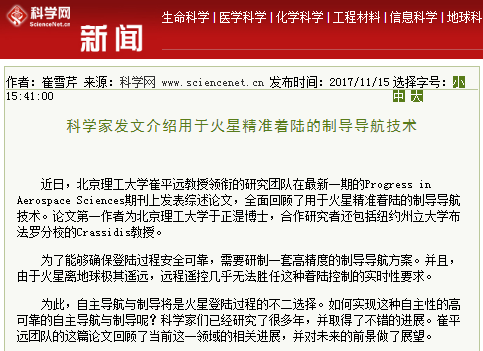 【科学网】bb贝博科研团队发文介绍用于火星精准着陆的制导导航技术