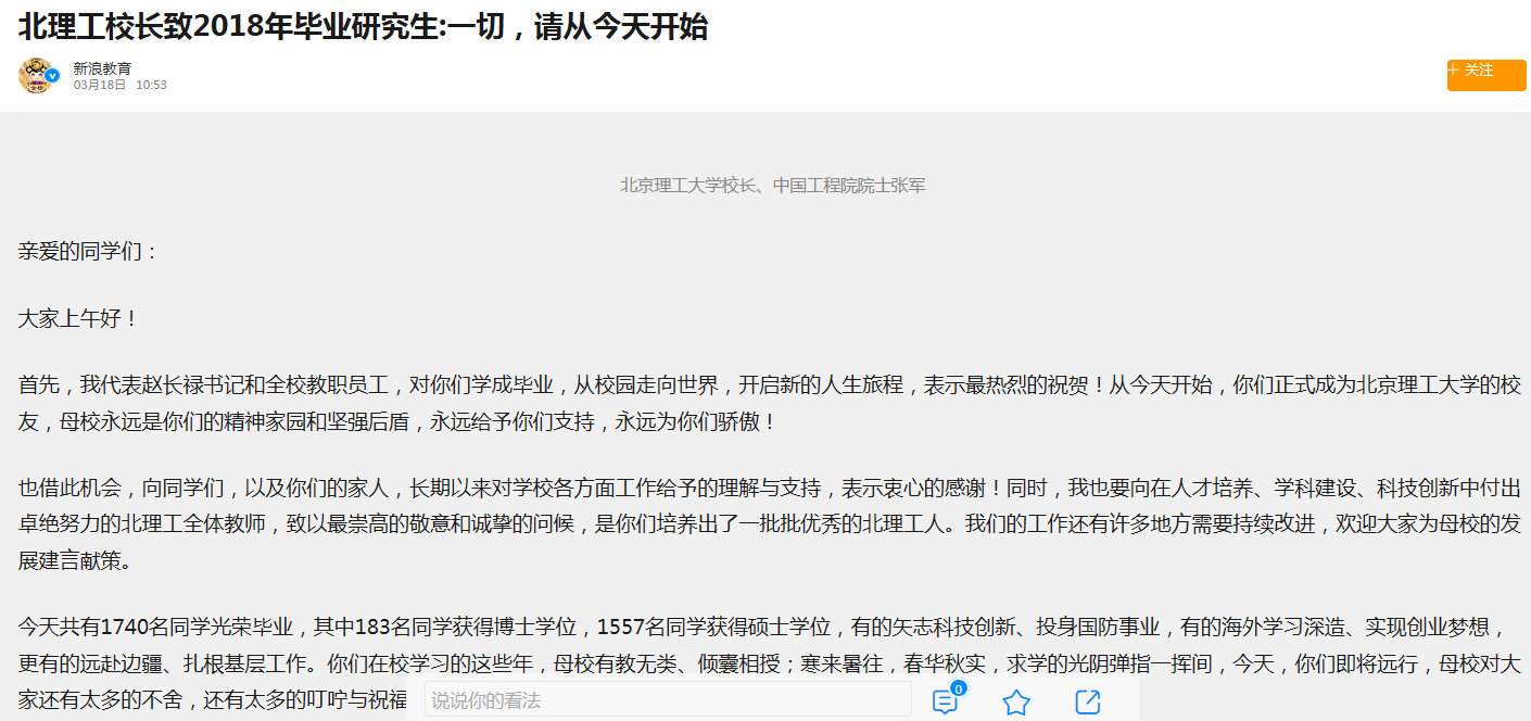 【新浪网】bb贝博校长致2018年毕业研究生:一切,请从今天开始