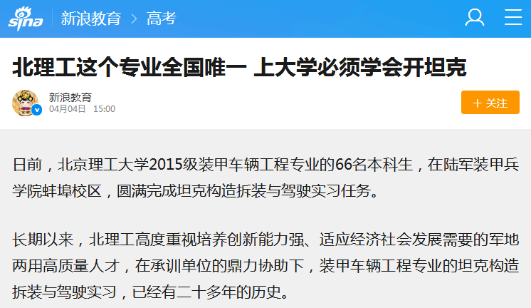 【新浪网】bb贝博这个专业全国唯一 上大学必须学会开坦克