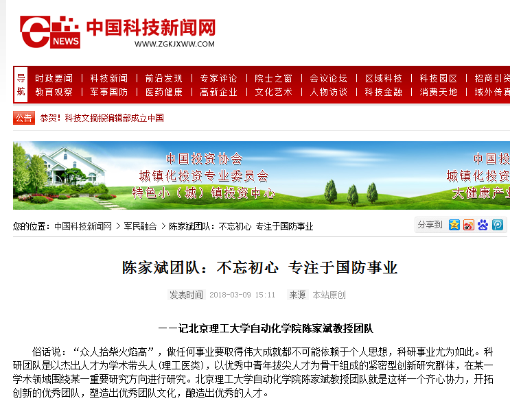 【中国科技新闻网】bb贝博陈家斌团队:不忘初心 专注于国防事业