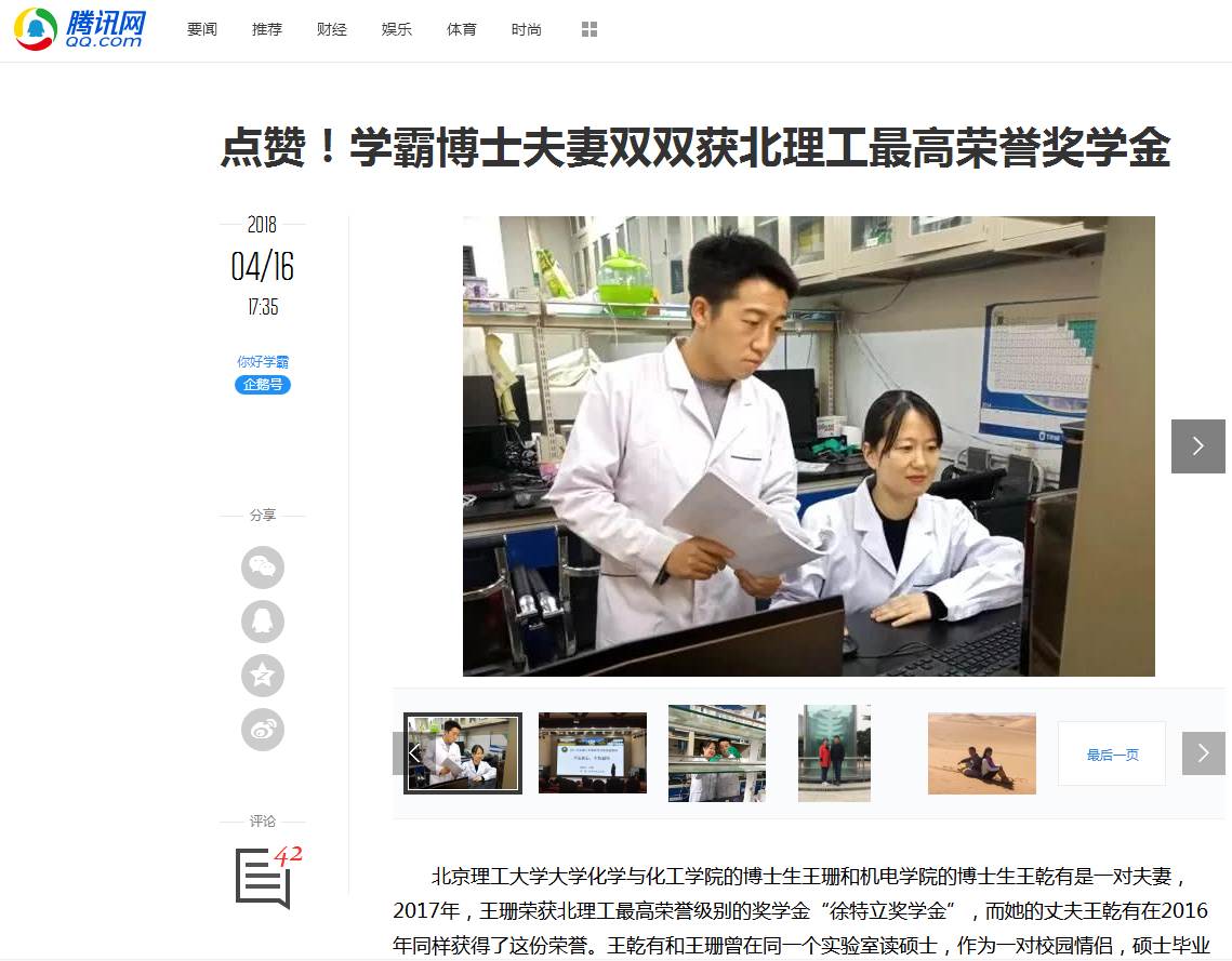 【腾讯网】博士夫妻双获bb贝博最高荣誉奖学金