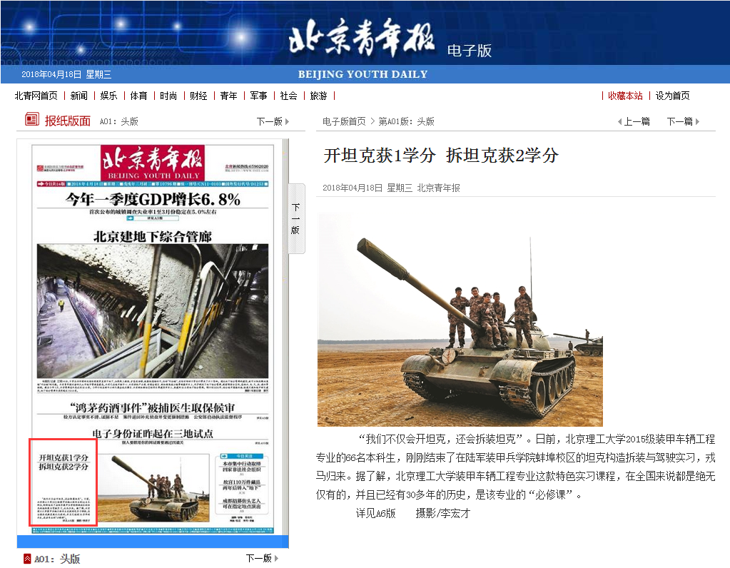 【北京青年报·头版】bb贝博:开坦克获1学分 拆坦克获2学分