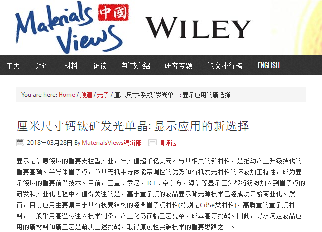 【Materials Views】bb贝博钟海政课题组:厘米尺寸钙钛矿发光单晶—— 显示应用的新选择