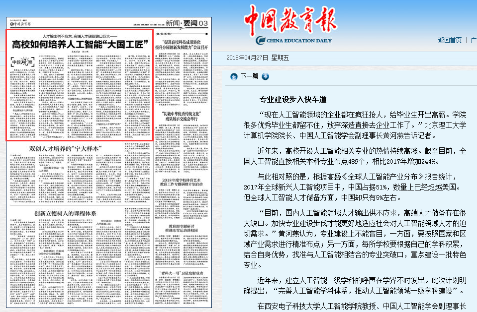【中国教育报】bb贝博黄河燕教授就“高校如何培养人工智能‘大国工匠’”发表看法