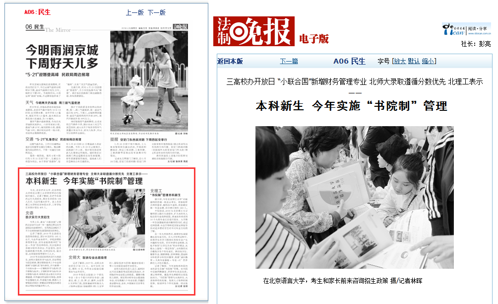【编者按】5月20日,bb贝博艾弗森官方网站举办了校园开放日活动,2018年bb贝博在全国各省份普通本科一批招生时,实行“0调剂”政策,面向北京考生承诺100%满足其首选专业 。不仅如此,2018年bb贝博继续深入推行大类招生,扩大本科生入校后的专业选择范围。普通本科将采用10个大类专业名目进行招生,入学第一年加强基础和通识教育的同时,通过名师授课、专业引导和进实验室体验等形式逐步增进学生对不同专业方向的了解。此外,学校面向本科新生实施“书院制”管理。在书院中实施博雅教育,培养学生优良品质;通过导师制,激发学生潜能和自我发展动力。《法制晚报》、北青网、中青在线、新浪网等各大媒体第一时间进行了报道。