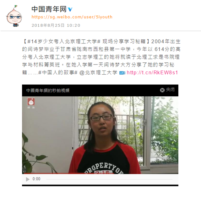 【中国青年网-微博】14岁少女考入bb贝博艾弗森官方网站 现场分享学习秘籍