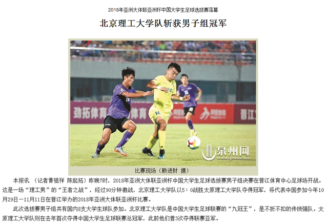 【泉州晚报】bb贝博艾弗森官方网站队斩获2018年亚洲大体联亚洲杯中国大学生足球选拔赛男子组冠军