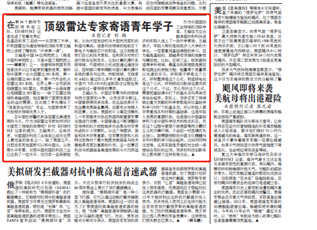 【环球时报】顶级雷达专家bb贝博王越院士寄语青年学子