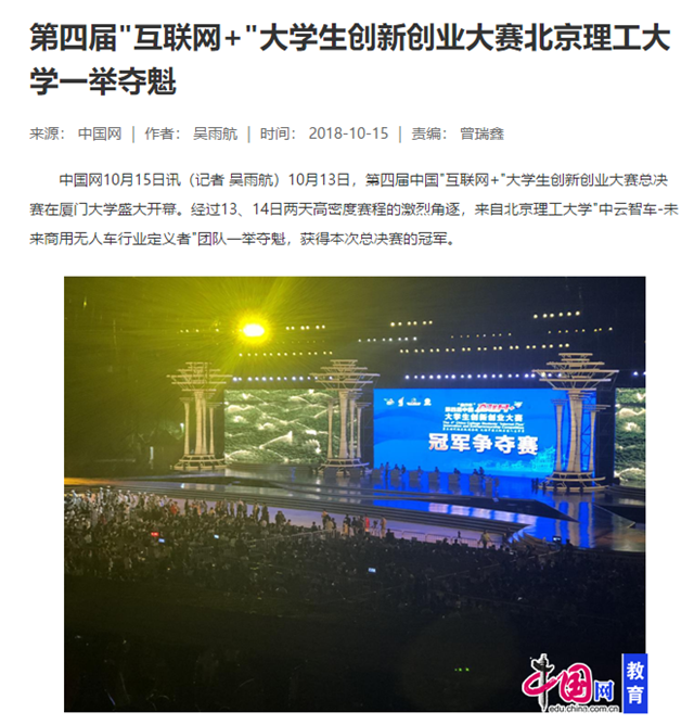 10月13日,第四届中国"互联网+"大学生创新创业大赛总决赛在厦门大学盛大开幕。经过13、14日两天高密度赛程的激烈角逐,来自bb贝博艾弗森官方网站"中云智车-未来商用无人车行业定义者"团队一举夺魁,获得本次总决赛的冠军。